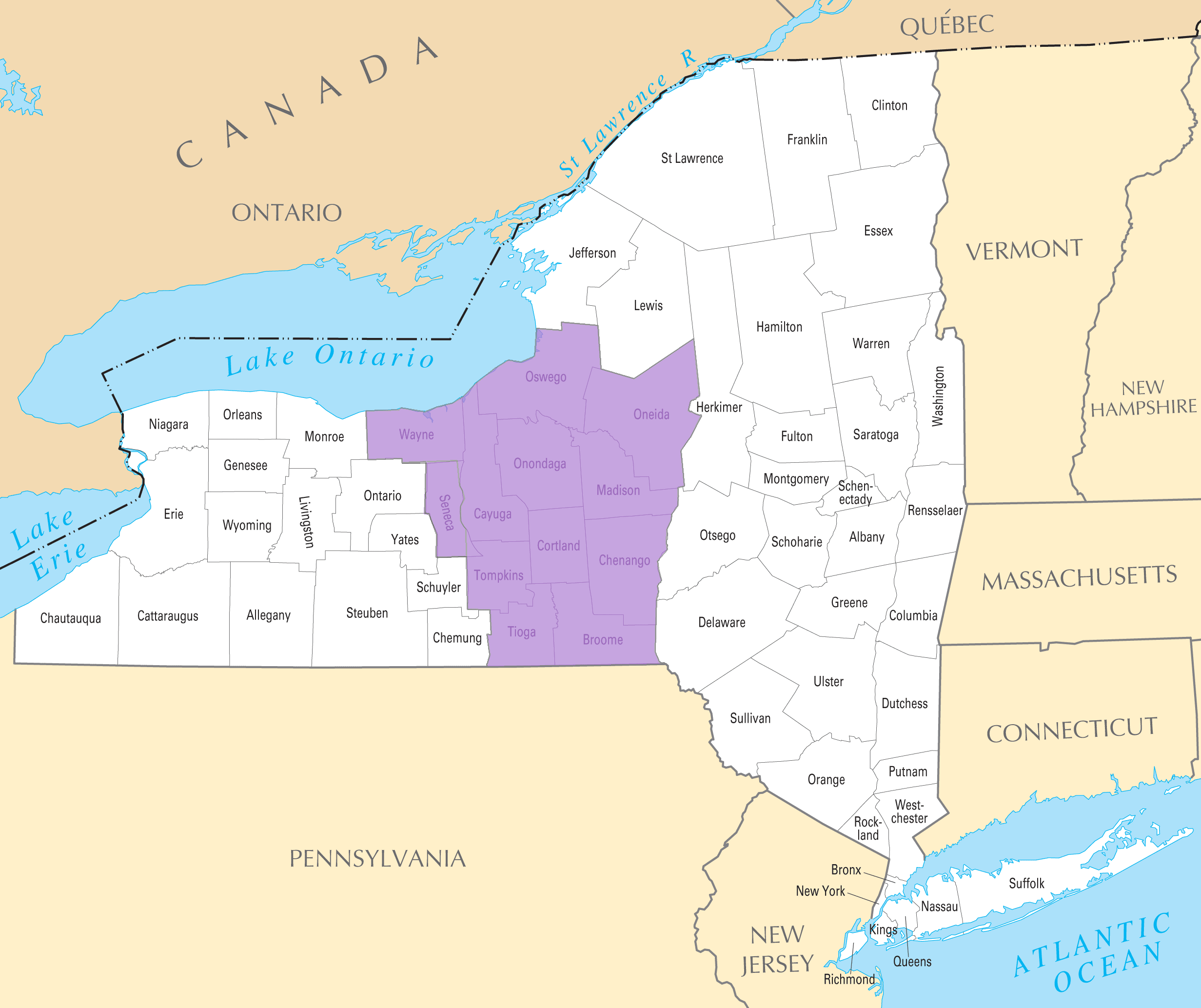 We currently work across Central New York, including: Broome, Cayuga, Chenango, Cortland, Madison, Oneida, Onondaga, Ontario, Oswego, Seneca, Tioga, Tompkins, Wayne. Shown below in purple.